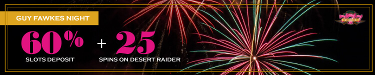 Celebrate Guy Fawkes Night with TripleSeven! Enjoy a 60% deposit match plus 25 free spins on Desert Raider. Light up your gameplay today!