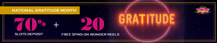 Celebrate November of Gratitude with TripleSeven! Get a 70% slots deposit bonus plus 20 free spins on Wonder Reels. Don’t miss out—play and give thanks for big wins!