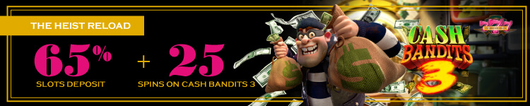 Every time you use this code we will give you a 65% match bonus and 25 Bonus Spins on Cash Bandits 3 to boost your balance even more.