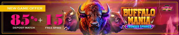 Every time you use this code, we will give you an 85% match bonus and 15 Bonus Spins on Buffalo Mania: Thunder Springs to boost your balance even more.