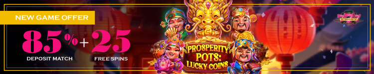 Every time you use this code, we will give you an 85% match bonus and 25 Bonus Spins on Prosperity Pots: Lucky Coins to boost your balance even more.